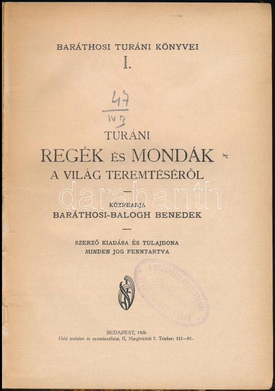 Baráthosi-Balogh Benedek: Turáni regék és mondák a világ teremtéséről. Baráthosi Turáni Könyvei I. Bp.,1926, Szerzői kiadás, (Held Irodalmi és Nyomdavállalat, 159 p. Első kiadás. Átkötött kopottas félvászon-kötés, az eredeti papírborítót az átkötéskor felhasználták.