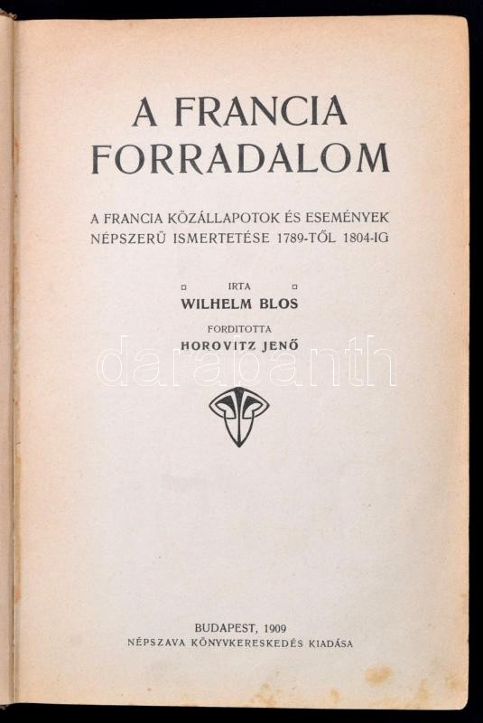 Blos, Wilhelm: A francia forradalom. A francia közállapotok és események népszerű ismertetése 1789-től 1804-ig. Bp., 1909, Népszava Könyvkereskedés. Kiadói egészvászon kötés, ragasztott gerinc, viseltes állapotban.