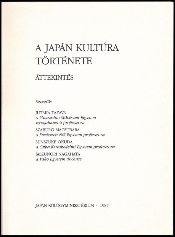Jutaka Tazava-Szaburo Macsubara-Sunszuke Okuda-Jaszunori Nagahata: A japán kultúra története. Áttekintés. hn., 1987, Japán Külügyminisztérium. Kiadói papírkötés, jó állapotban.