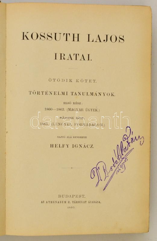 Kossuth Lajos Iratai. V. kötet: Történelmi tanulmányok. Első rész: 1860-1863. (Magyar ügyek.) Második rész: 1863. (Lengyel forradalom.) Sajtó alá rendezte: Helfy Ignác. Bp.,1895, Athenaeum, XI+500+3 p. Kiadói egészvászon kötésben, jó állapotban