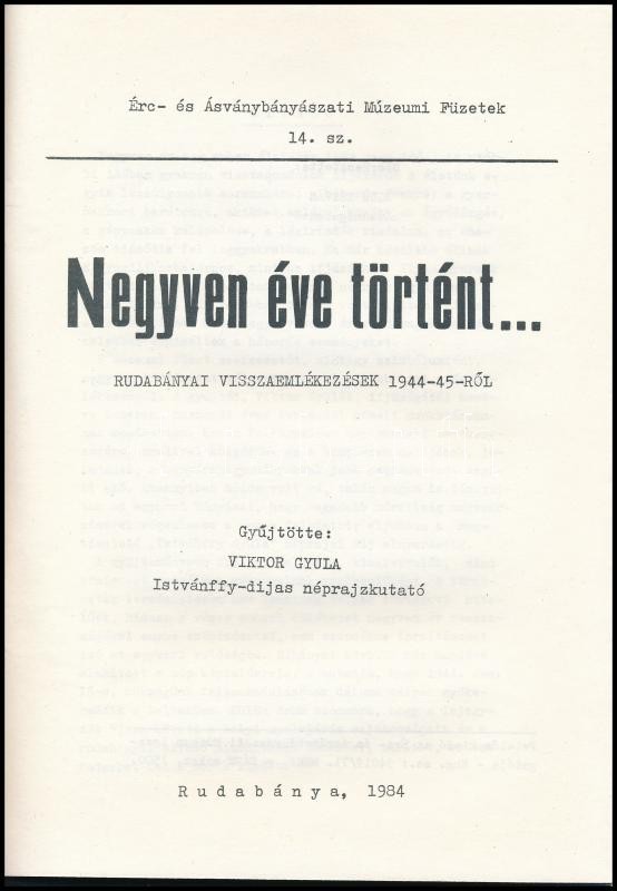 Negyven éve történt... Rudabányai visszaemlékezések 1944-1945-ről. Gyűjtötte Viktor Gyula. Szerk.: Bics István. Érc- és Ásványbányászati Múzeumi Füzetek 14. sz. Rudabánya, 1984, Érc- és Ásványbányászati Múzeum, 46 p. Kiadói papírkötés. Megjelent 1500 példányban.