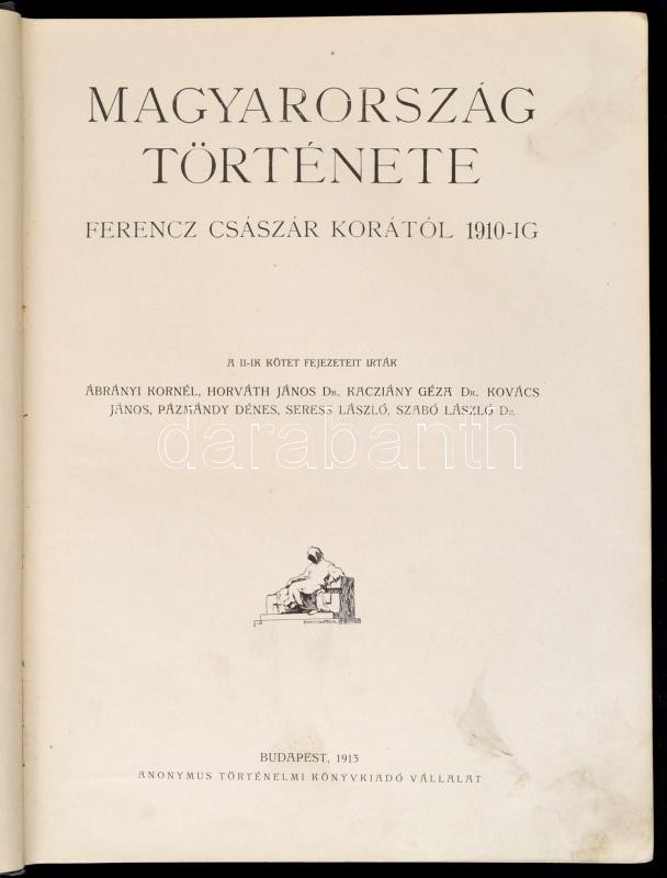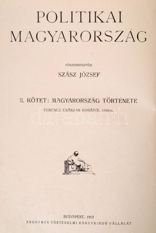 Politikai Magyarország. I-III. kötet. Szerk.: Szász József. Bp., 1912-1913, Anonymus Történelmi Könyvkiadó Vállalat. Szövegközti képekkel és egészoldalas táblákkal illusztrálva. Kiadói szecessziós aranyozott, festett egészvászon-kötés, Dörner és Heimberg-kötés, kopott, foltos borítóval, sérült gerincekkel, könyvtári címkékkel, de belül jó állapotban.
