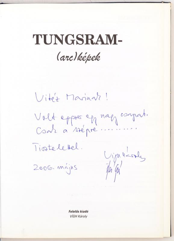 Tungsram-(arc)képek. Szerk.: Víg Károly et al. Bp.,2005, Szerzői kiadás, (Rétrion-ny.) Kiadói műbőr-kötés, kissé kopott borítóval. Megjelent 800 példányban. Első kiadás. Két szerkesztő, Vígh Károly és P. Szabó Gábor dedikációjával.