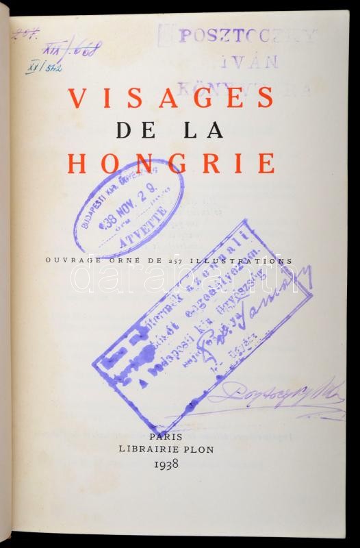 Visages de La Hongrie. Paris, 1938, Libraire Plon, 621+3 p.+1 t.( kihajtható térkép.) Fekete-fehér illusztrációkkal. Kiadói papírkötés, kopott borítóval, francia nyelven. /