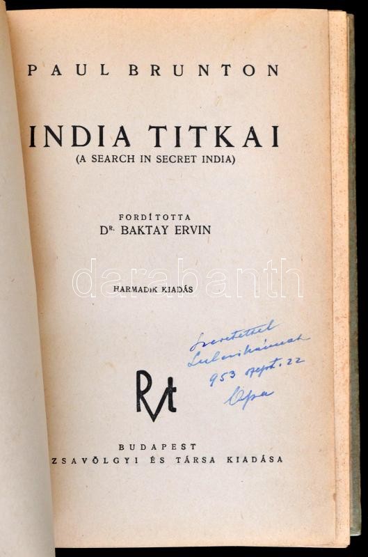 Brunton, Paul: India titkai. Fordította: dr. Baktay Ervin. Bp., é.n., ... https://www.darabanth.com/hu/342-Gyorsarveres/342.0/Konyvek/Konyvek-Utazas-helytortenet~1000001/Brunton-Paul-India-titkai-Forditotta-dr-Baktay-Ervin-Bp-en-Rozsavolgyi-Harmadik-kiad~II1911641