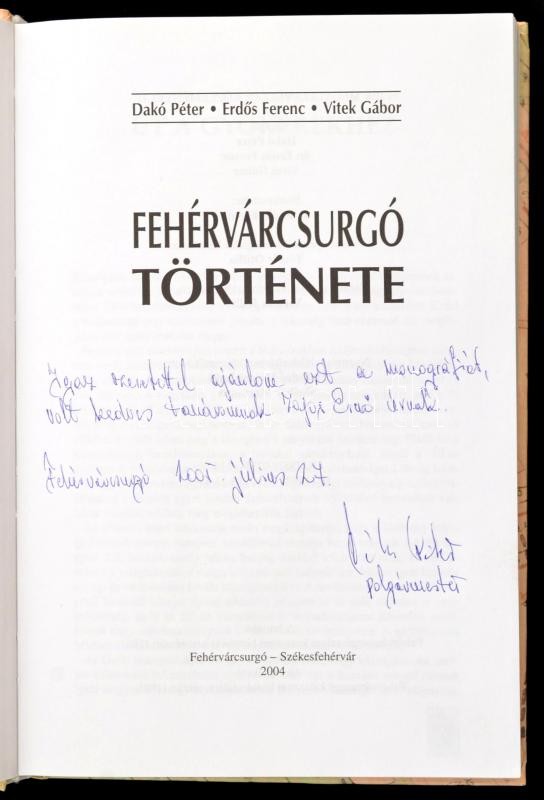 Dakó Péter - ErdÅ‘s Ferenc - Vitek Gábor: Fehérvárcsurgó története. Fehérvárcsurgó - Székesfehérvár, 2004, Fejér Megyei Levéltár. Dakó Péter polgármester dedikációjával. Kartonált papÃrkötésben, jó állapotban.