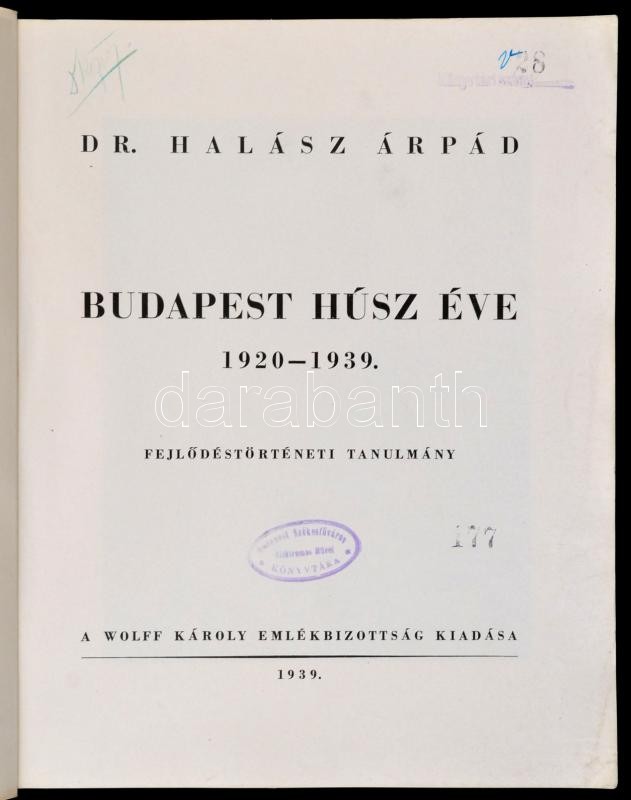 Dr. Halász Árpád: Budapest húsz éve. 1920-1939. Fejlődéstörténeti tanulmány. Bp., 1939, Wolff Károly Emlékbizottság. Fekete-fehér fotókkal illusztrált. Kiadói papírkötésben.