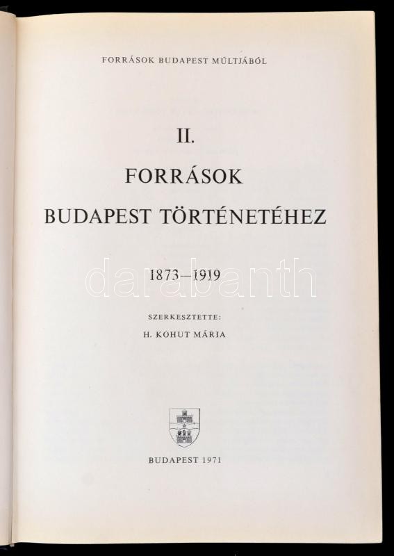 Források Budapest múltjából II. kötet. 1873-1919. Szerk.: Bácskai Vera. Budapest Főváros Levéltára Forráskiadványai II. kötet. Bp., 1971, Fővárosi Levéltár. Kiadói aranyozott műbőrkötésben.