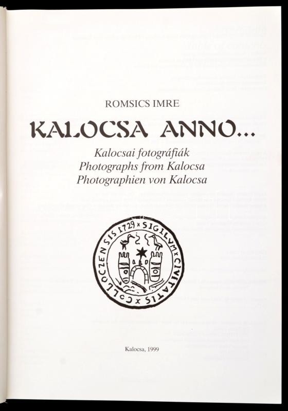 Leírás: Romsics Imre: Kalocsa anno... Kalocsai fotográfiák. Kalocsa, 1999, Kalocsai Múzeumbarátok Köre. Kartonált papírkötésben, jó állapotban.