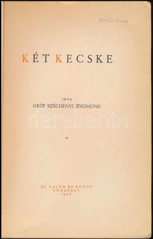 Széchényi Zsigmond: Két kecske. Bp.,1942, Dr. Vajna György és Bokor, (Athenaeum-ny.), 195 p. Egészoldalas fekete-fehér fotókkal. Papírkötésben. Első kiadás.