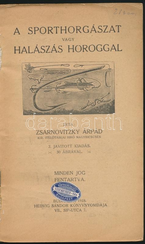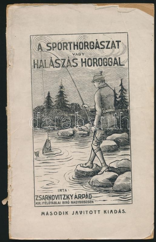 Zsarnovitzky Árpád: A sporthorgászat vagy halászás horoggal. Bp.,1918, Hedvig Sándor, 108 p. Második, javított kiadás. Kiadói papírkötésben, szakadt borítóval, a hátsó borító lejár, a gerince részben hiányos.