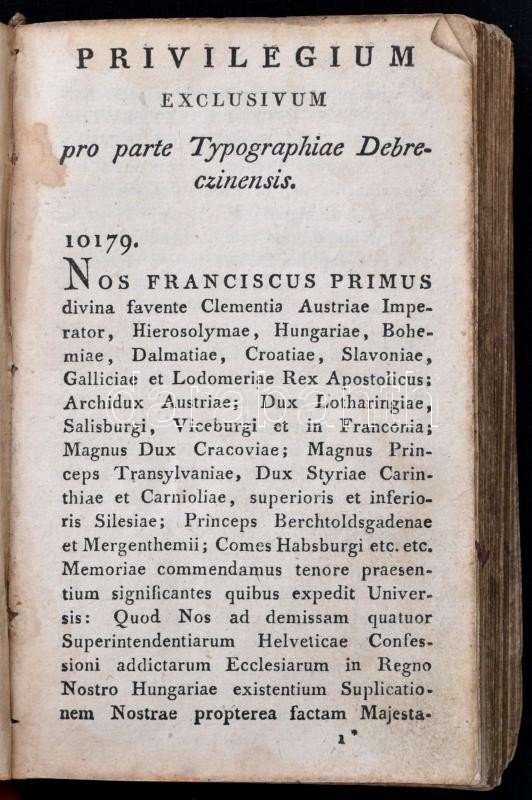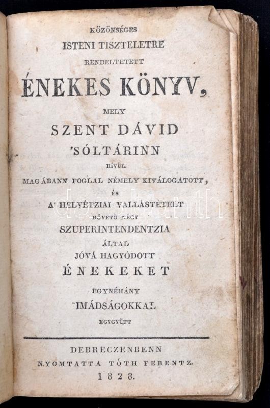 Közönséges Isteni tiszteletre rendeltetett Énekes Könyv, melly Szent Dávid 'sóltárin kívűl magában foglal némelly kiválogatott, és a' Helvétziai vallástételt követő négy szuperintendentzia által jóvá hagyódott énekeket, egynéhány imádságokkal egygyütt. Debreczenbenn, 1828, Nyomtatta Tóth Ferencz. X, (11)-544, 46 p. Szövegközti kottákkal. Megviselt korabeli egészbőr kötésben.