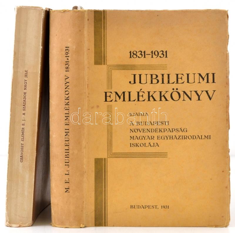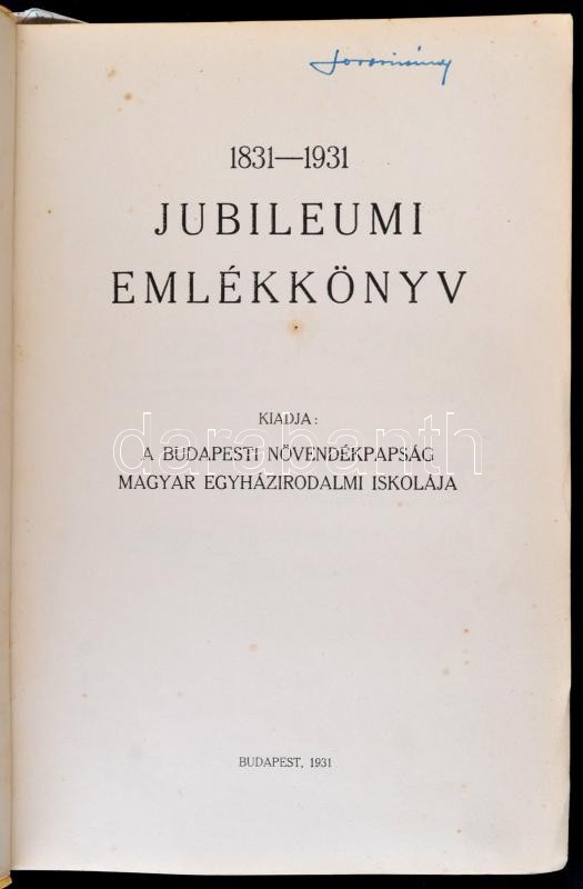 1831-1931. Jubileumi emlékkönyv. Kiadja a Budapesti Növendékpapság Magyar Egyházirodalmi Iskolája. Bp.,1931,(Vác, Kapisztrány Nyomda.) Kiadói papírkötésben, a borítószéleken apró szakadással.