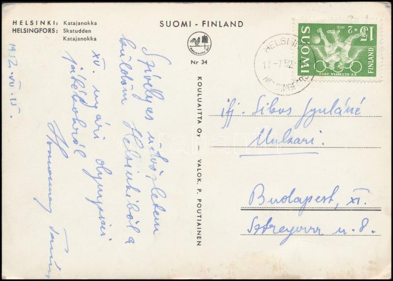 Leírás: 1952 Helsinki, Homonnay Tibor rúdugró üdvözlő sorai és aláírása az olimpiai játékokról küldött levelezőlapon