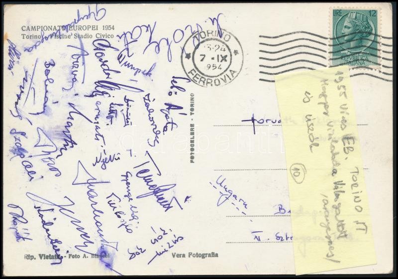 Leírás: 1955 A torinói vizes EB-n résztvevő magyar vízilabda válogatott tagjai és úszók aláírásai levelezőlapon