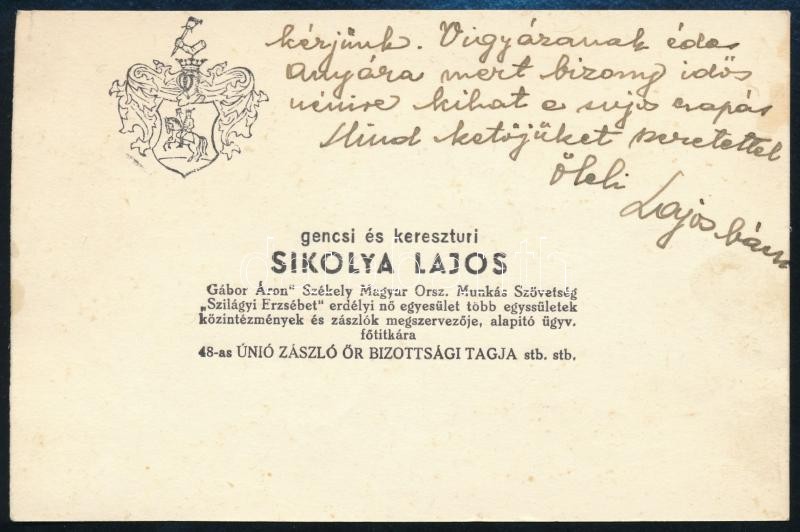 cca 1930-1940 gencsi és keresztúri Sikolya Lajos (?-?) "Gábor Áron" Székely Magyar Orsz. Munkás Szövetség, "Szilágyi Erzsébet" Erdélyi Nő Egyesület főtitkárának, "Bem Apó" Székely Polgári Lövész Egyesület elnökének sorai és aláírása névjegykártyáján, valamint plusz egy névjegykártyája.