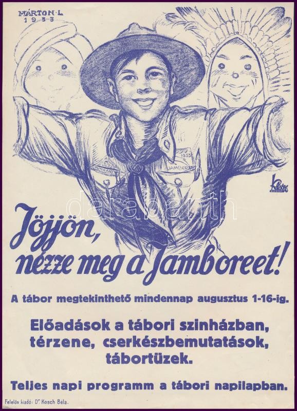 1933 Gödöllő cserkész Jamboree kisplakát / Scout World Jamboree small ... https://www.darabanth.com/hu/342-Gyorsarveres/342.0/Mutargy-papirregiseg-egyeb/Cserkesz~500026/1933-Godollo-cserkesz-Jamboree-kisplakat-Scout-World-Jamboree-small-poster-S-Marton-17x24~II1919594