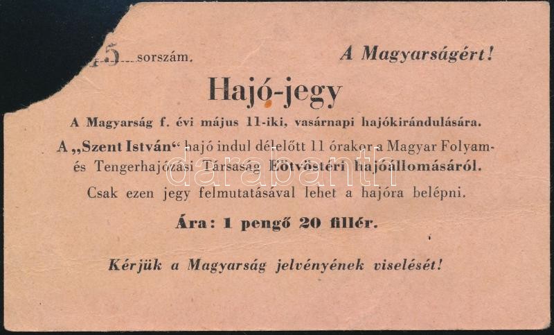 Leírás: cca 1930 A Magyarság c. újság hajókirándulására szóló hajójegy