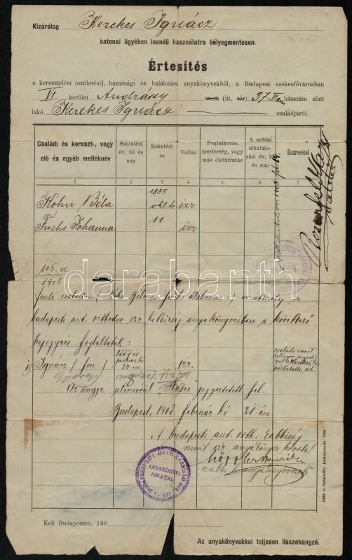 1908 A pesti izraelita hitközség anyakönyvi kivonata katonai ügyben, h... https://www.darabanth.com/hu/342-Gyorsarveres/342.0/Mutargy-papirregiseg-egyeb/Judaika~500025/1908-A-pesti-izraelita-hitkozseg-anyakonyvi-kivonata-katonai-ugyben-hajtasok-menten-serult~II1924907