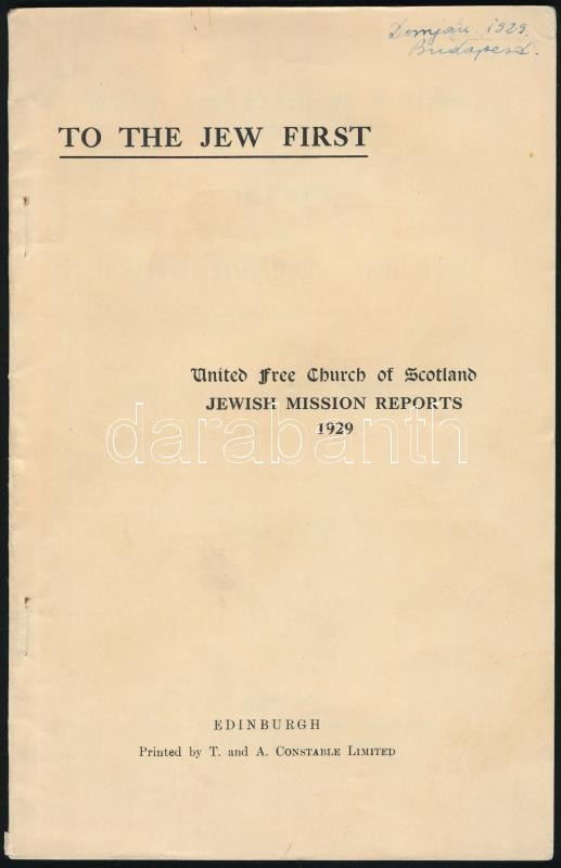 1929 To the Jew First, United Free Church of Scotland Jewish Mission R... https://www.darabanth.com/hu/342-Gyorsarveres/342.0/Mutargy-papirregiseg-egyeb/Judaika~500025/1929-To-the-Jew-First-United-Free-Church-of-Scotland-Jewish-Mission-Reports-40p~II1930085