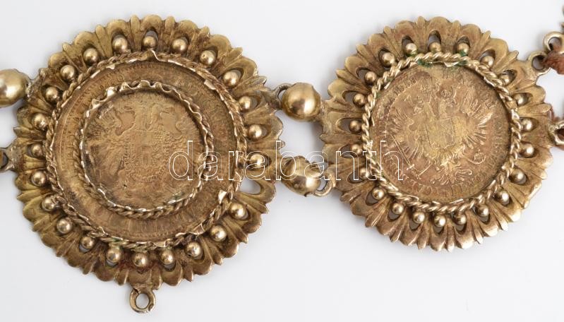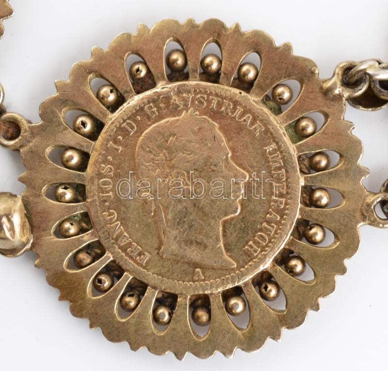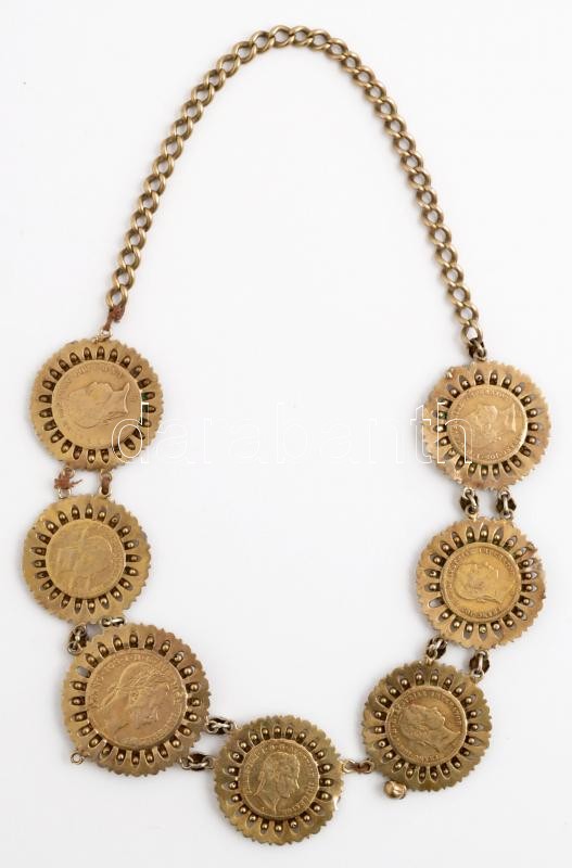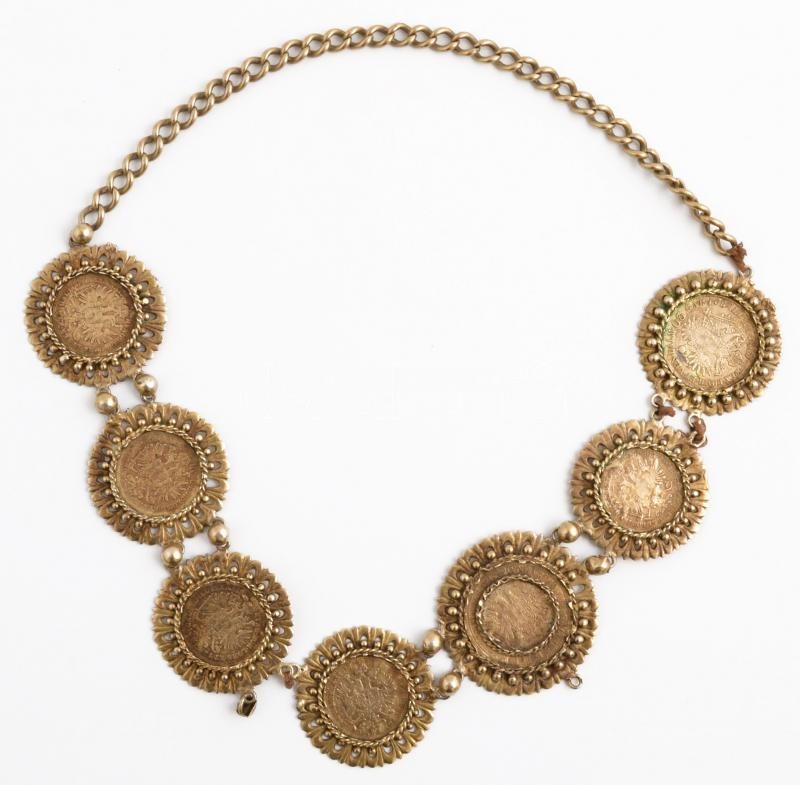 Leírás: Az Osztrák-Magyar Monarchia ezüstérmeiből készült aranyozott nyaklánc, maga a lánc anyaga nem ezüst, kapcsolódási hibákkal, h: 52 cm