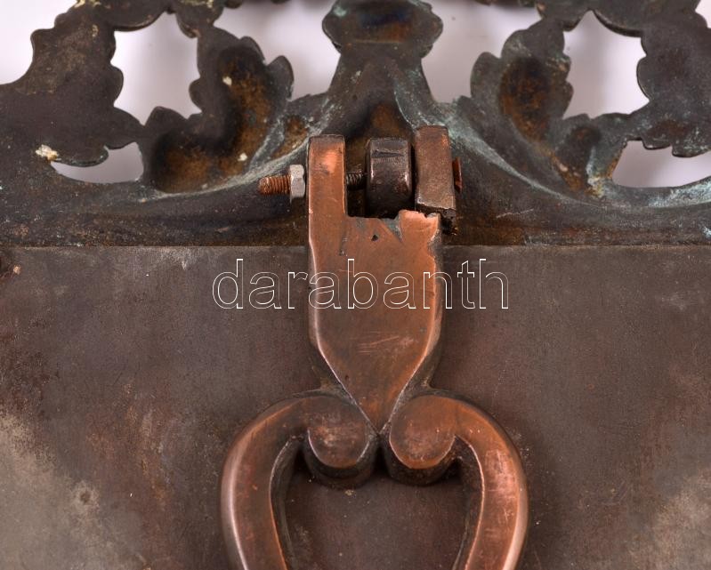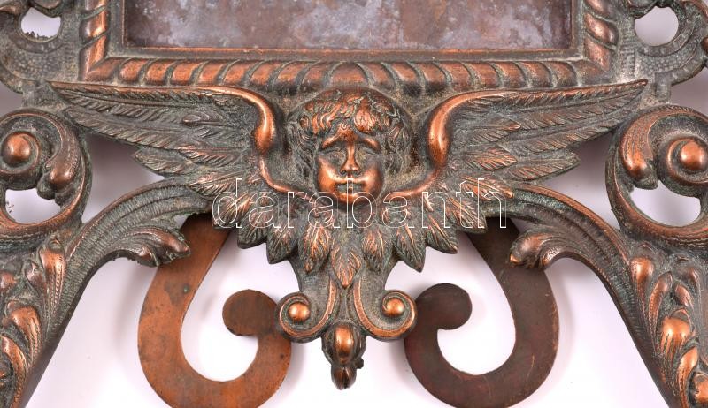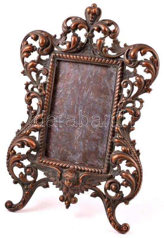 Leírás: Bronzírozott öntöttvas asztali képkeret. kitámasztó láb egyik fenti csapja törött 44 cm