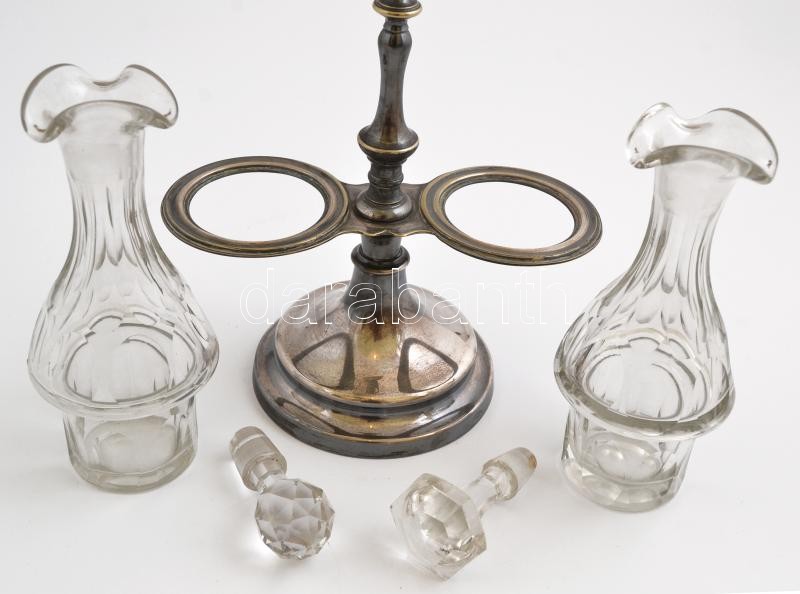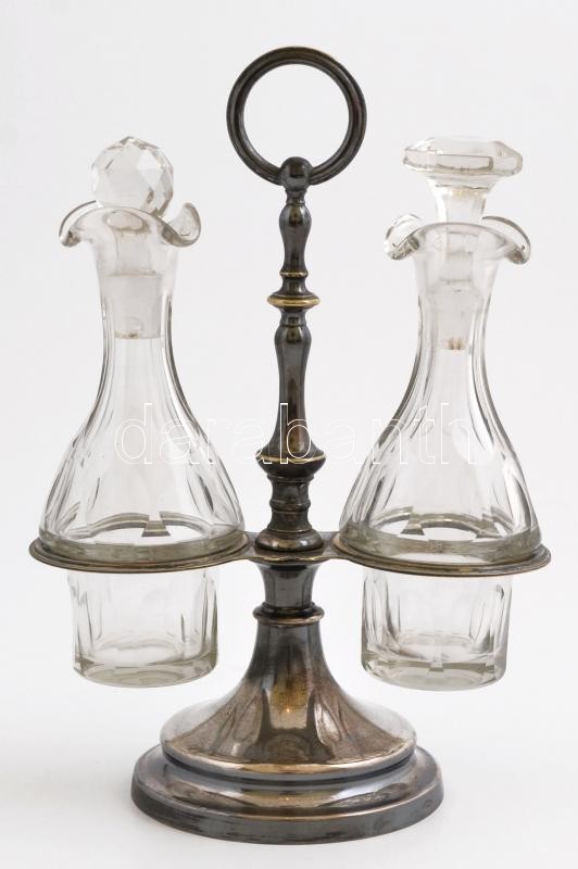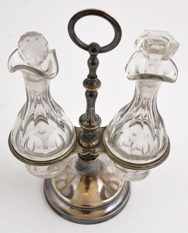 Leírás: Moritz Hacker Wien ecet és olajtartó, ezüstözött alpakka, jelzett, más-más sérült dugóval, m: 26,5 cm