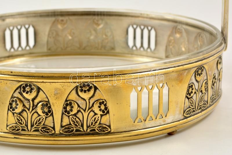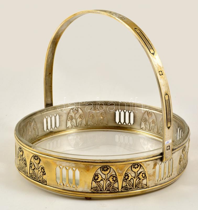 Leírás: Szecessziós Argentor nagy füles kínáló, üvegbetéten karcolásokkal, m: 22 cm, d:25 cm