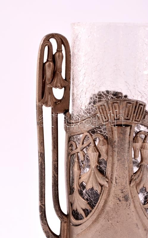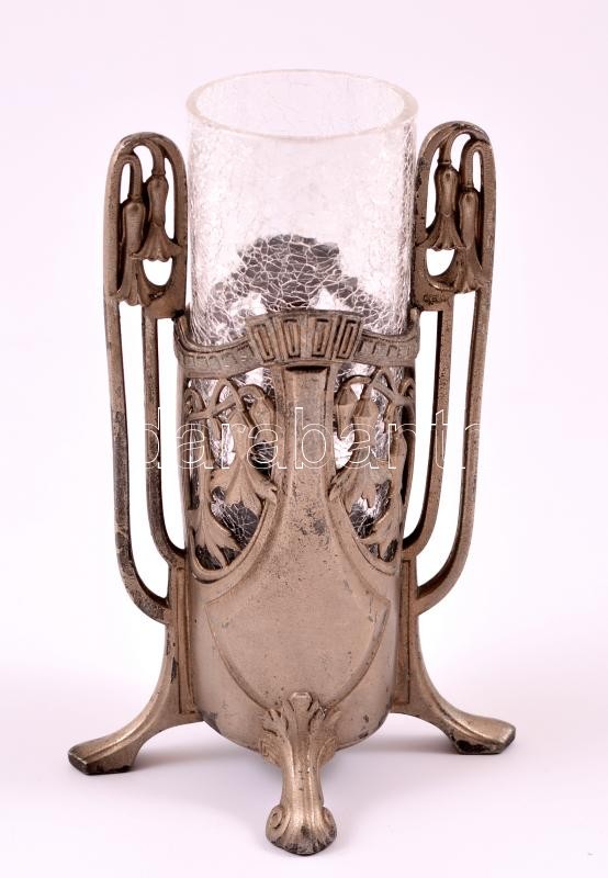 Leírás: W.M.F. szecessziós talpas ón váza, jelzett, hibátlan kraklé üvegbetéttel, kopott, m: 17 cm