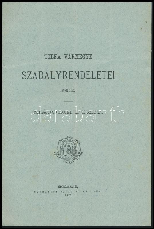 1892 Tolna vármegye szabályrendeletei. Második füzet. 8p. https://www.darabanth.com/hu/342-Gyorsarveres/342.0/Mutargy-papirregiseg-egyeb/Nyomtatvanyok~500030/1892-Tolna-varmegye-szabalyrendeletei-Masodik-fuzet-8p~II1910033