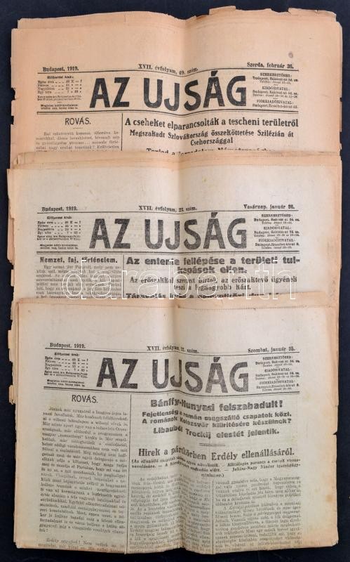 1919 Az Újság. 1919. január 25-26., február 26. XVII. évf. 22-23. sz., 49 sz., 8+10+8 p. Benne a kor híreivel, többek között: a román, és a cseh csapatokról, a Károlyi-pártról szóló hírekkel. Változó, részben szakadozott állapotban.