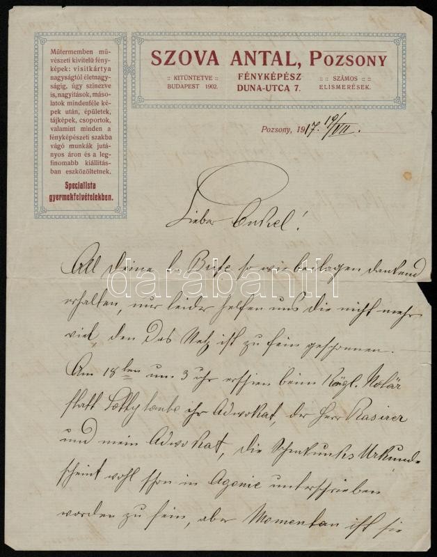 1917 Szova Antal pozsonyi fényképész levélpapírjára írt német nyelvű l... https://www.darabanth.com/hu/342-Gyorsarveres/342.0/Mutargy-papirregiseg-egyeb/Okmanyok~500018/1917-Szova-Antal-pozsonyi-fenykepesz-levelpapirjara-irt-nemet-nyelvu-level~II1927715