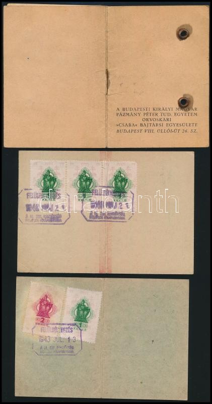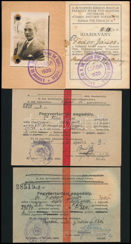 1930-1943 Budapesti Kir. M. Pázmány Péter Tudományegyetem Orvoskari "Csaba" Bajtársi Egyesületének fényképes igazolványa. Valamint ugyan ennek a személynek két fegyvertartási engedélye.