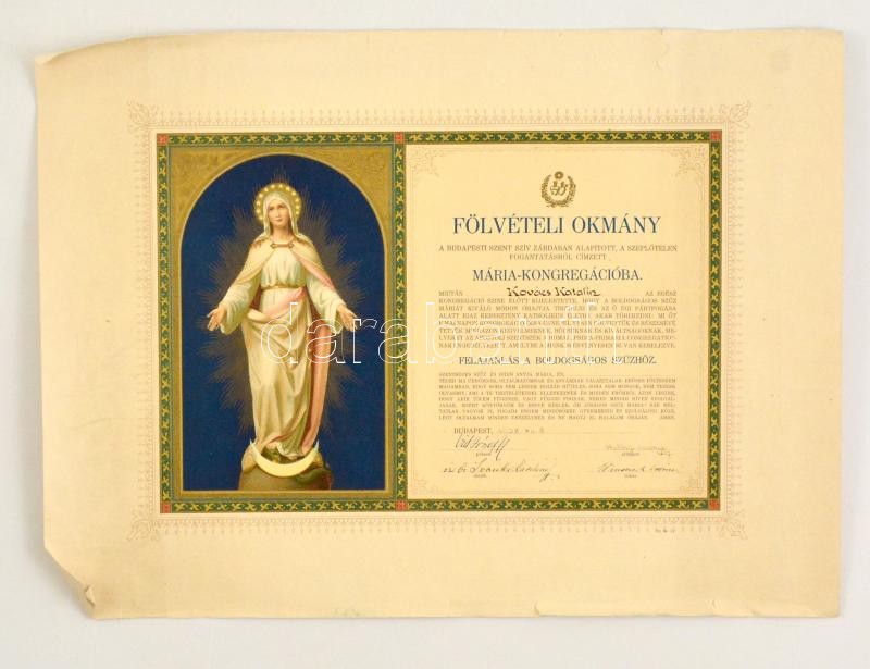 1938 BP., Felvételi okmány a Mária-Kongregációba, gyűrődésekkel, szaka... https://www.darabanth.com/hu/342-Gyorsarveres/342.0/Mutargy-papirregiseg-egyeb/Okmanyok~500018/1938-BP-Felveteli-okmany-a-Maria-Kongregacioba-gyurodesekkel-szakadasokkal~II1898608