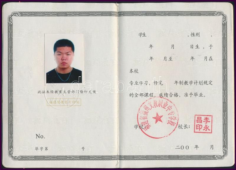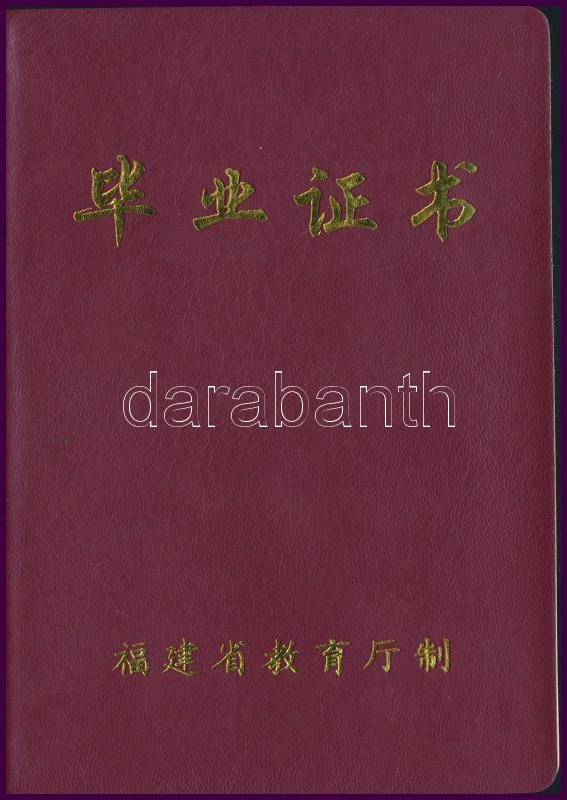 2000 Kína, kitöltetlen fényképes fujiani szakközépiskolai bizonyítvány https://www.darabanth.com/hu/342-Gyorsarveres/342.0/Mutargy-papirregiseg-egyeb/Okmanyok~500018/2000-Kina-kitoltetlen-fenykepes-fujiani-szakkozepiskolai-bizonyitvany~II1925629