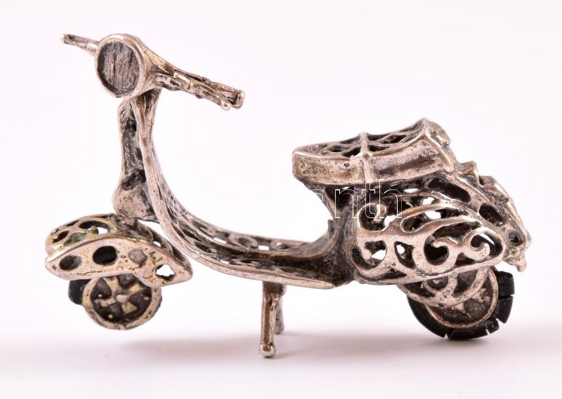 Leírás: Ezüst (Ag.) robogó, jelzés nélkül, első kereken a gumi hiányzik, 5×3,5 cm, nettó:14,8 g