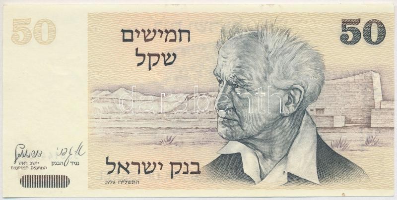 Krause 58.a https://www.darabanth.com/hu/342-Gyorsarveres/342.0/Numizmatika/Kulfoldi-bankjegyek~1500012/Izrael-1978-50S-TI-Israel-1978-50-Sheqalim-CUNC-Krause-58a~II1876737