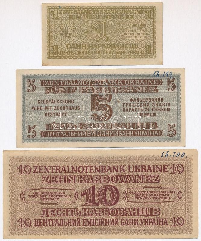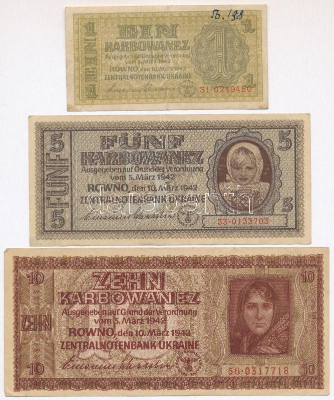 Ukraine / German occupation 1942. 1 Karbowanez + 5 Karbowanez + 10 Karbowanez C:G