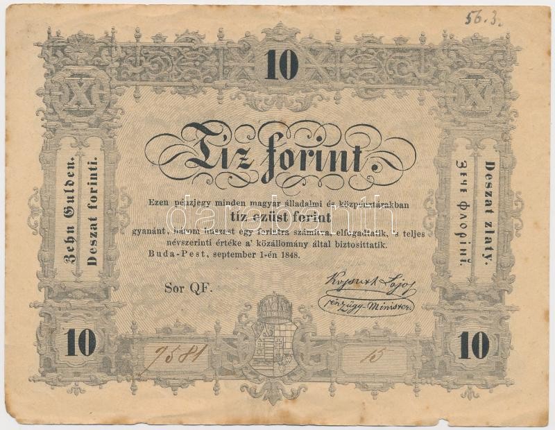 Leírás: 1848. 10Ft "Kossuth Bankó" T:II- fo., kis anyaghiány, kis szakadás