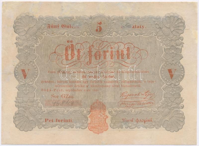 Leírás: 1848. 5Ft vörösesbarna, barna hátlap T:III- restaurált