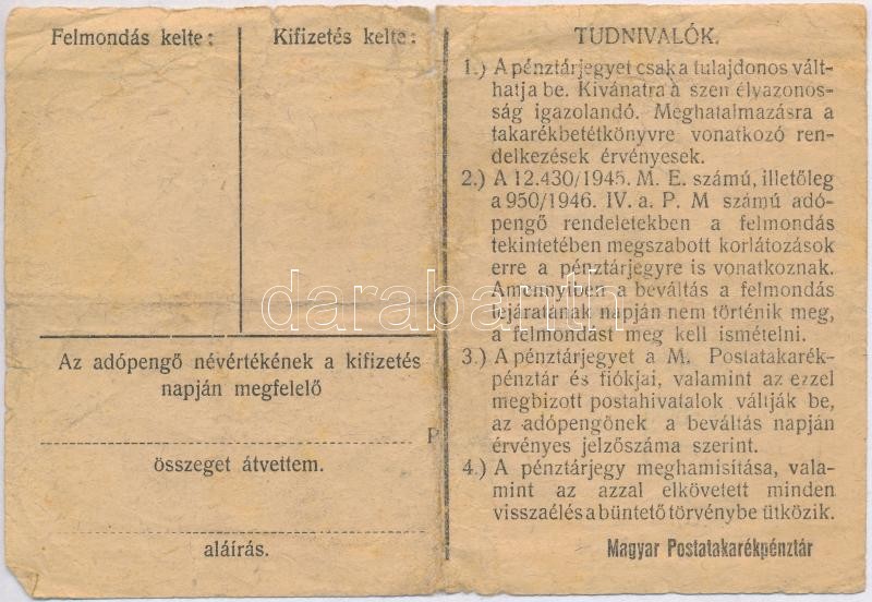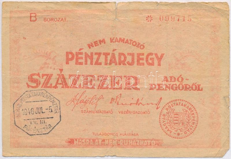 Leírás: 1946. 100.000AP nem kamatozó Pénztárjegy "Magyar Királyi Postatakarékpénztár" felülbélyegzéssel T:III szakadás