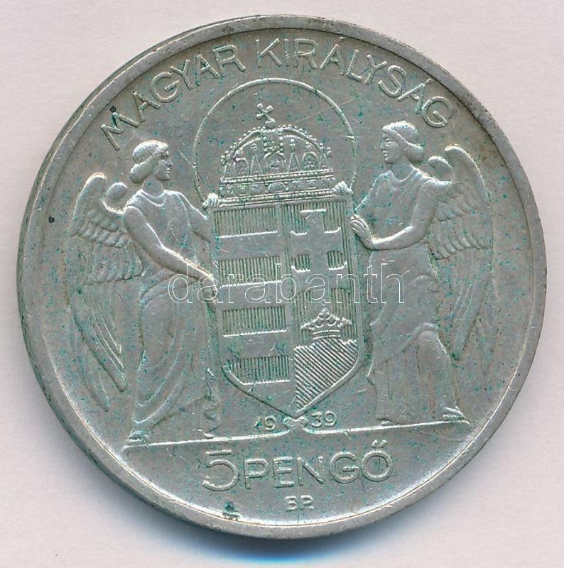 Leírás: 1939. 5P Ag "Horthy balra" T:2 kis ph., patina