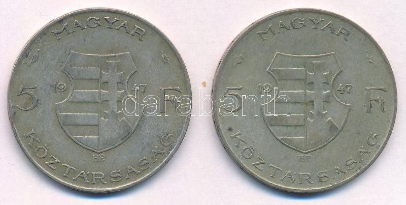 1947. 5Ft Ag "Kossuth" (2x) T:2-,3 ph. https://www.darabanth.com/hu/342-Gyorsarveres/342.0/Numizmatika/Magyar-es-magyar-verdejelu-fem-es-ezustpenzek~1500008/1947-5Ft-Ag-Kossuth-2x-T2-3-ph~II1925757