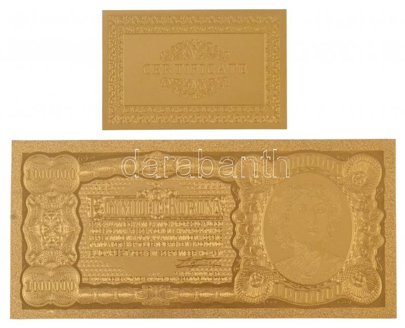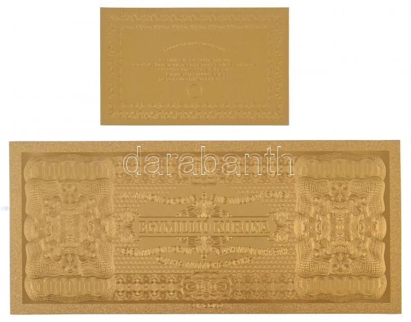 Leírás: 1923. 1.000.000K aranyozott bankjegy replika, aranyozott tanúsítvánnyal T:I
