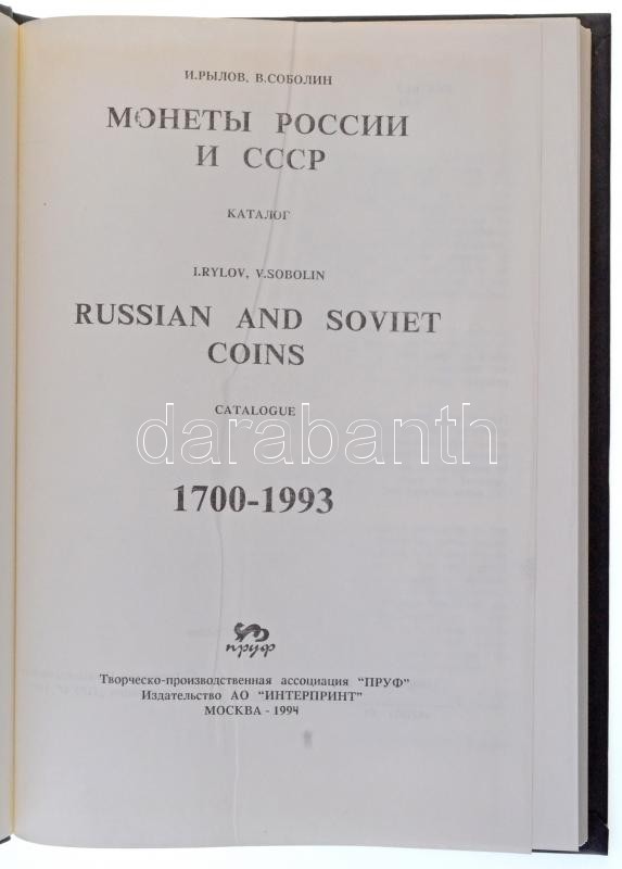 I. Rylov, V. Sobolin: Russian and Soviet Coins 1700-1993. Moszkva, 1994. Orosz-angol nyelvű katalógus, használt, jó állapotban, egyes oldalak kissé gyűröttek.