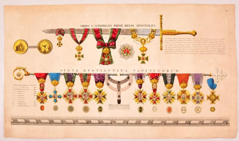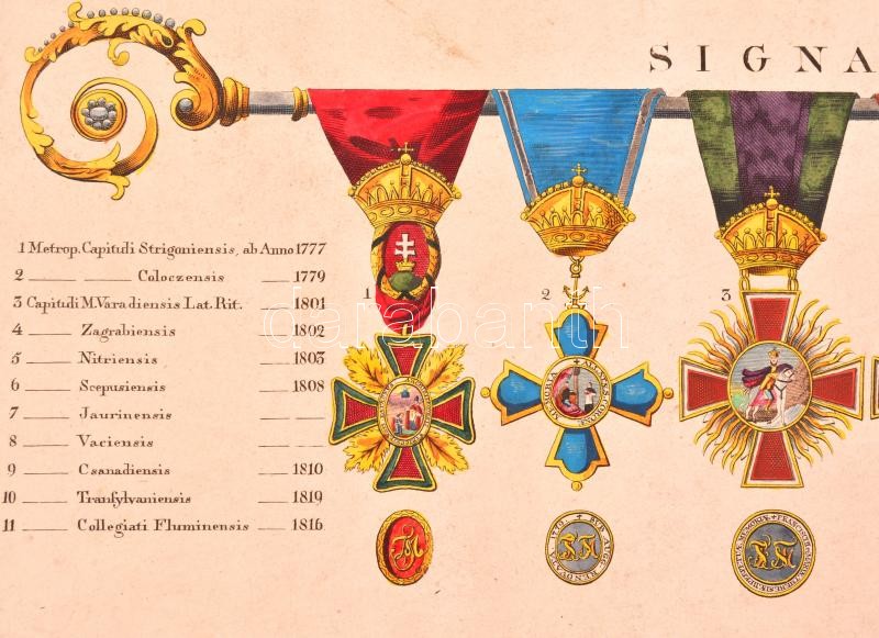 1845 A Szent István rend valamint püspöki változatait bemutató színezett rézmetszetű tábla. 55x29 cm Megjelent : Aszalay József: Mappa generalis topographico-ecclesiastico- ethnographico statistica regni Hungariae partiumque, Buda, 1845.