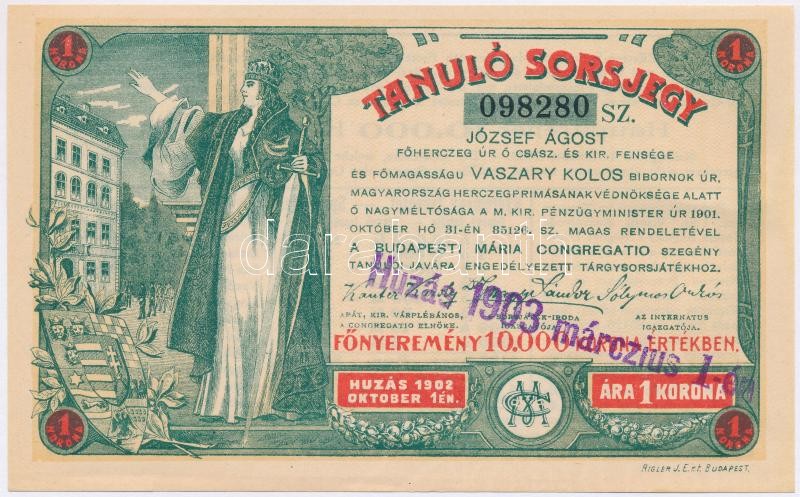 Budapest 1903. "Tanuló Sorsjegy" 1K értékben, felülbélyegzés... https://www.darabanth.com/hu/342-Gyorsarveres/342.0/Numizmatika/Reszvenyek-es-sorsjegyek~1500005/Budapest-1903-Tanulo-Sorsjegy-1K-ertekben-felulbelyegzessel-TI-~II1926368