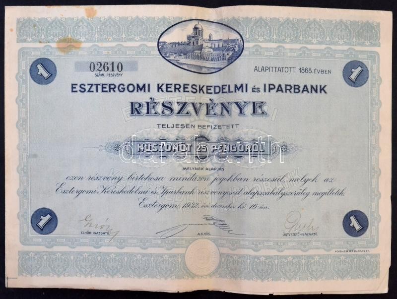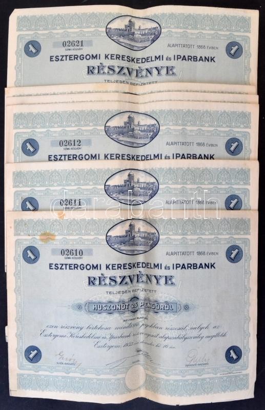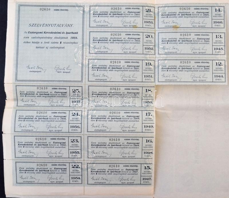 Esztergom 1932. "Esztergomi Kereskedelmi és Iparbank" részvénye teljesen befizetett 25P-ről, szárazpecséttel és szelvényekkel (6x) benne négy sorszámkövető és egy egyugrásos sorszámkövető pár T:III
