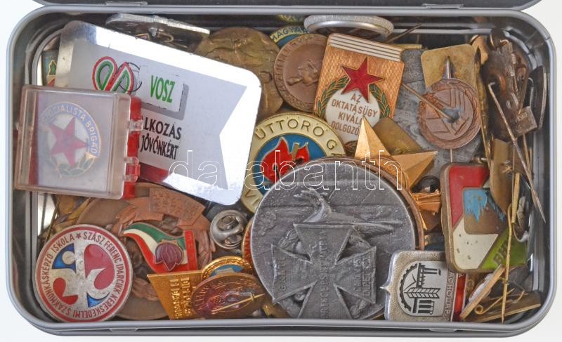 Leírás: Kis fémdoboznyi vegyes, főleg magyar jelvény, kitűző és emlékérem tétel T:vegyes