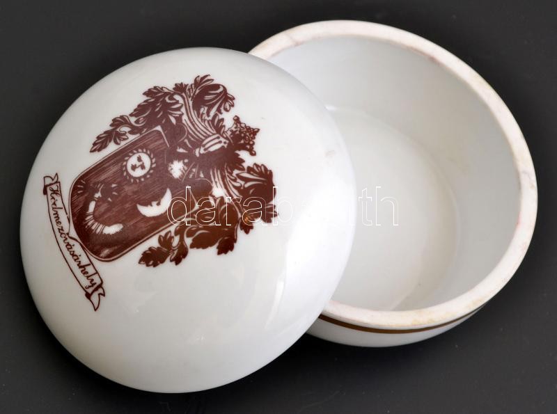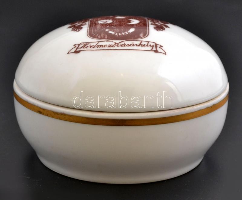 Leírás: Alföldi porcelán bonbonier Hódmezővásárhely címerével, matricás, jelzett, kis kopásnyomokkal, d: 9 cm, m: 5 cm